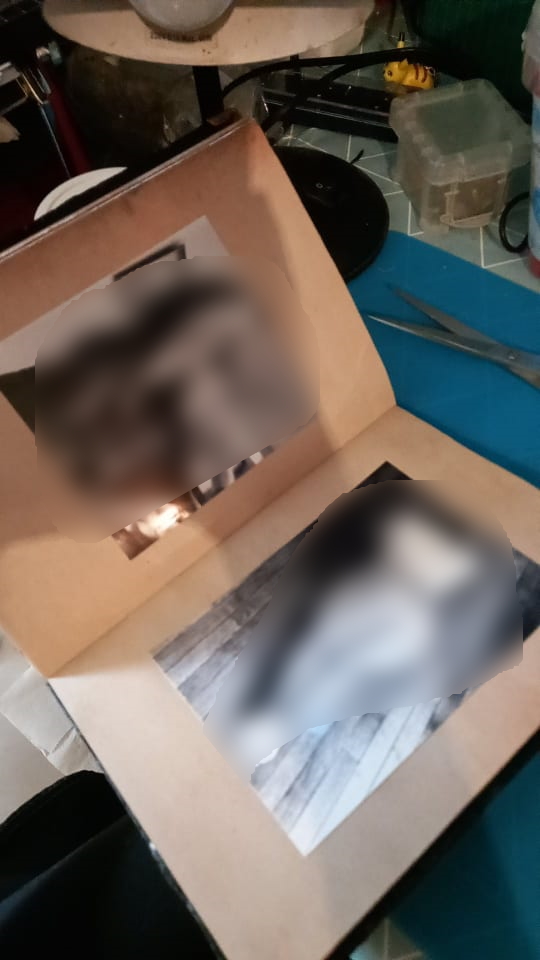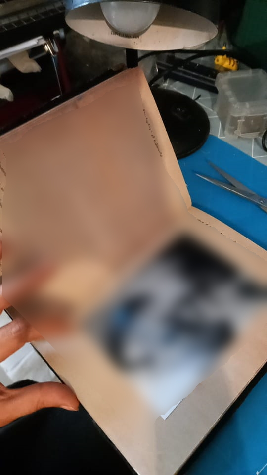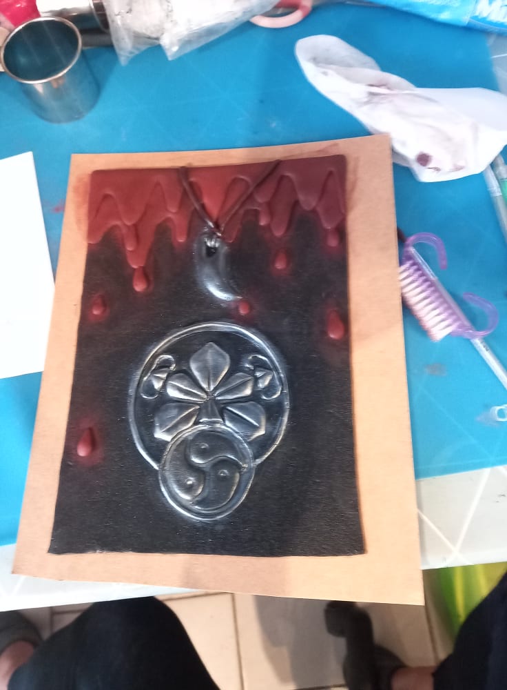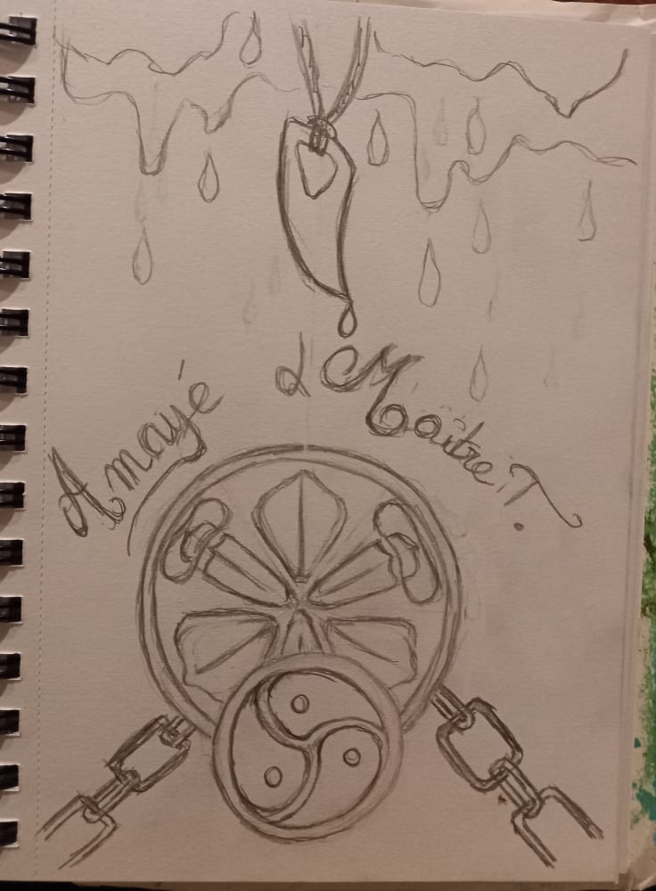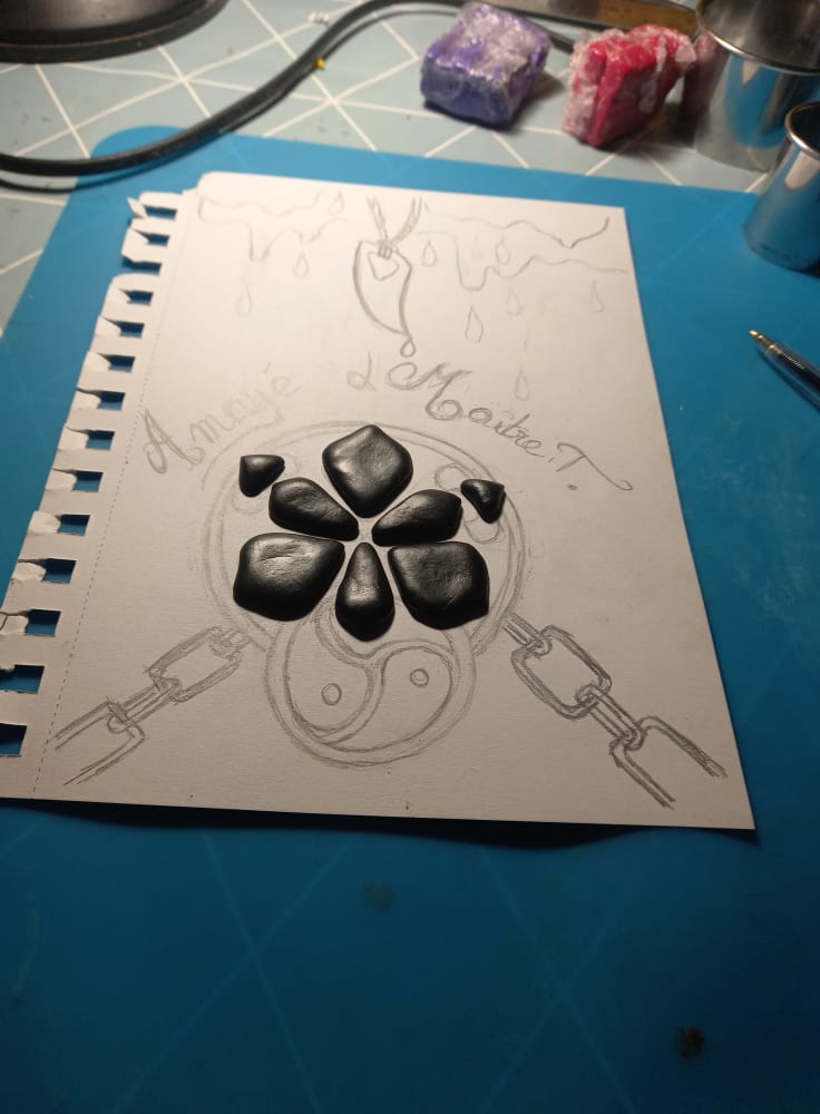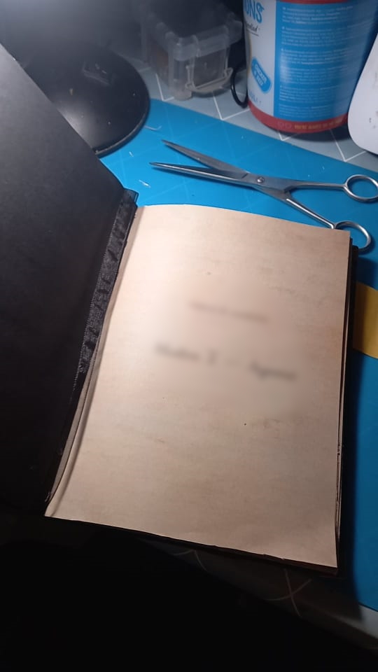 Tout commence avec un message de M.L. qui souhaite offrir une réalisation unique à sa douce pour son anniversaire, il m’explique dans les grandes lignes qu’il faudrait quelque chose dans lequel je pourrais écrire ou imprimer un texte qui leur est cher (environ 20 pages A5) et incorporer quelques photos. Il lui faut quelque chose un peu Dark, donc on oublie les paillettes, froufrous, licornes et bisounours, quelque chose qui les représente lui et elle, il m’annonce dans la foulée une sacrée contrainte: le délai, je n’aurai que 5 jours ouvrés pour réaliser ce que je vais lui proposer. À ce moment-là, j’ai déjà en tête ce que je peux lui proposer, mais j’hésite car j’ai un peu peur de ne pas réussir à respecter les délais. Allez, tant pis, au pire je ferai des heures supplémentaires, je me lance et lui propose l’idée du carnet. Nous échangeons sur ce qu’il désire comme visuel, à peu près. Si possible, il faudrait qu’un serpent apparaisse ainsi que leur tatouage, de la cire et le pendentif en forme de croc de monsieur. Peu à peu, l’image se forme dans ma caboche et je peux assez vite lui proposer un croquis de ce que je me sens capable de faire dans les délais impartis. C’est validé, je me lance dans la confection de cette création pas comme les autres…
